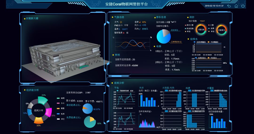 建筑模型信息系统(BIM)能够将各个建筑元素建立起内在的本身信息,并且整合建筑生命周期,使其能够改良规划、设计、建设、操作、和维护的流程之模型系统,并且能够充份的应用在营建工程上面。今年会jinnianhui物联能源互联网大厦便是借助于BIM技术的优势,在规划阶段进行了日照、风和热负荷等模拟,在基本方案的基础上进行BIM正向设计,同时以第二代物联网大数据管控Coral平台为核心,秉承“先节费,再节能”的运营原则,完成能源多项流转的实时监测、动态策略的下发调整,进而实现能源的最合理配给。